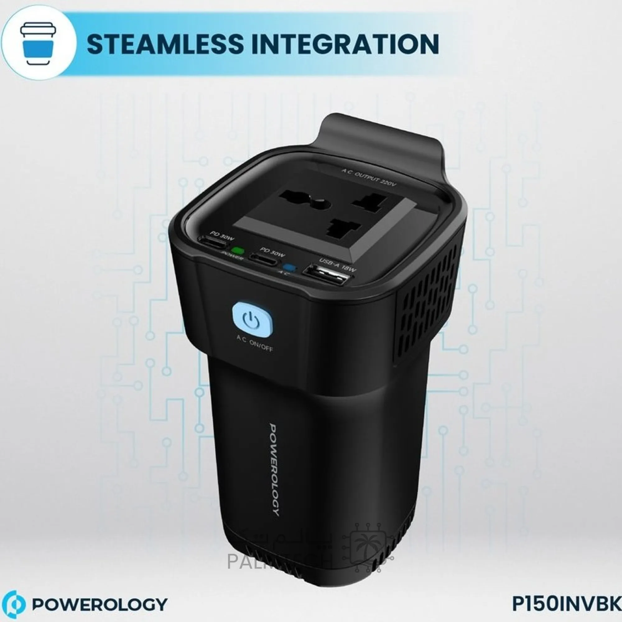 اینورتر فندکی خودرو پاورولوژی ۱۵۰ وات مدل P150INVBK Powerology 150W Cup Holder Power Inverter Dual USB-C & USB-A QC3.0 – P150INVBK